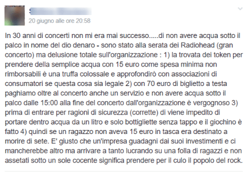 Un altro problema, non da poco se si considerano caldo e costi anticipati, sono state le aree parcheggio. Ne abbiamo parlato proprio dopo la serata dei Radiohead a Monza, i parcheggi erano molto più lontani rispetto a quanto annunciato, molti utenti hanno riportato che i pagamenti per le navette non erano nemmeno ufficiali, il personale non era controllato nè identificato. L’abusivismo rimane una costante, come per il chiacchierato e odiato sistema dei token, che ha favorito notevolmente i “vucumprà” che passano con bottiglie di bibite fresche tra la folla in un Festival che non garantisce scorte d’acqua sufficienti per tutte le persone presenti. Si leggono decine e decine di testimonianze di persone che sono state in coda per ore e una volta arrivate al bancone non c’era più acqua a disposizione. “Viene segnalata l’impossibilità di trovare trasporti pubblici o taxi (anche a chiamata) che connettessero gli accessi del parco alla stazione ferroviaria dopo la fine dell’evento” aggiunge Lorenzo.