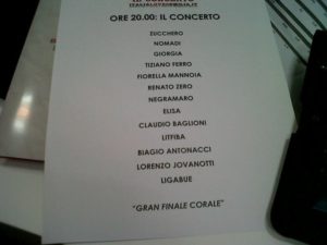 Iniziamo con l’ordine delle esibizioni che ha visto aprire con Zucchero e terminare con Ligabue, molti momenti dedicati proprio alla memoria di una terra stupenda che ha dovuto fare i conti con il pesante terremoto che l’Italia ha visto da lontano ma che l’Emilia ha vissuto profondamente da vicino. Una scritta “Siamo tutti qui per un motivo. Grazie” appare sugli schermi e lo spettacolo prende il via proprio con Zucchero.