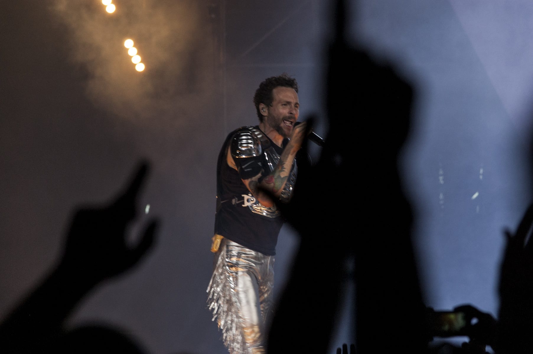 “Sono stato nel futuro. Lo so che è difficile credermi, ma l’ho visto ed è più incasinato di oggi”. Ma l’invito di Lorenzo è di vivere il presente “int’e viche mmiezo all’ate”. Il capitano Cherubini indossa l’armatura, la voce fuori campo (un video di Ornella Muti nell’incipit dello show, ndr) lo convince a tornare nel presente, e la folla si scatena sul ritmo di “Penso Positivo”. E via così con “Tutto acceso”, “Attaccami la Spina”, “L’Alba”, “Una scintilla”, “Sabato”, il capitano è una vera forza della natura. Il tempo di guardarsi intorno, cercare di cogliere l’impatto dei presenti: niente, il viaggio è partito, nulla potrà fermare questa alchimia.