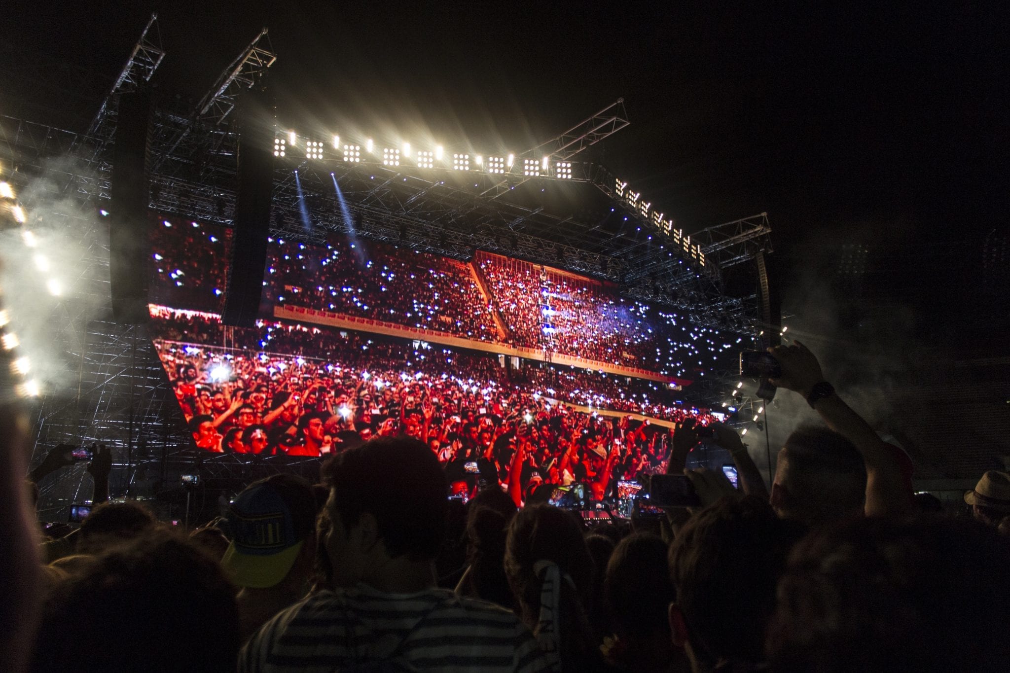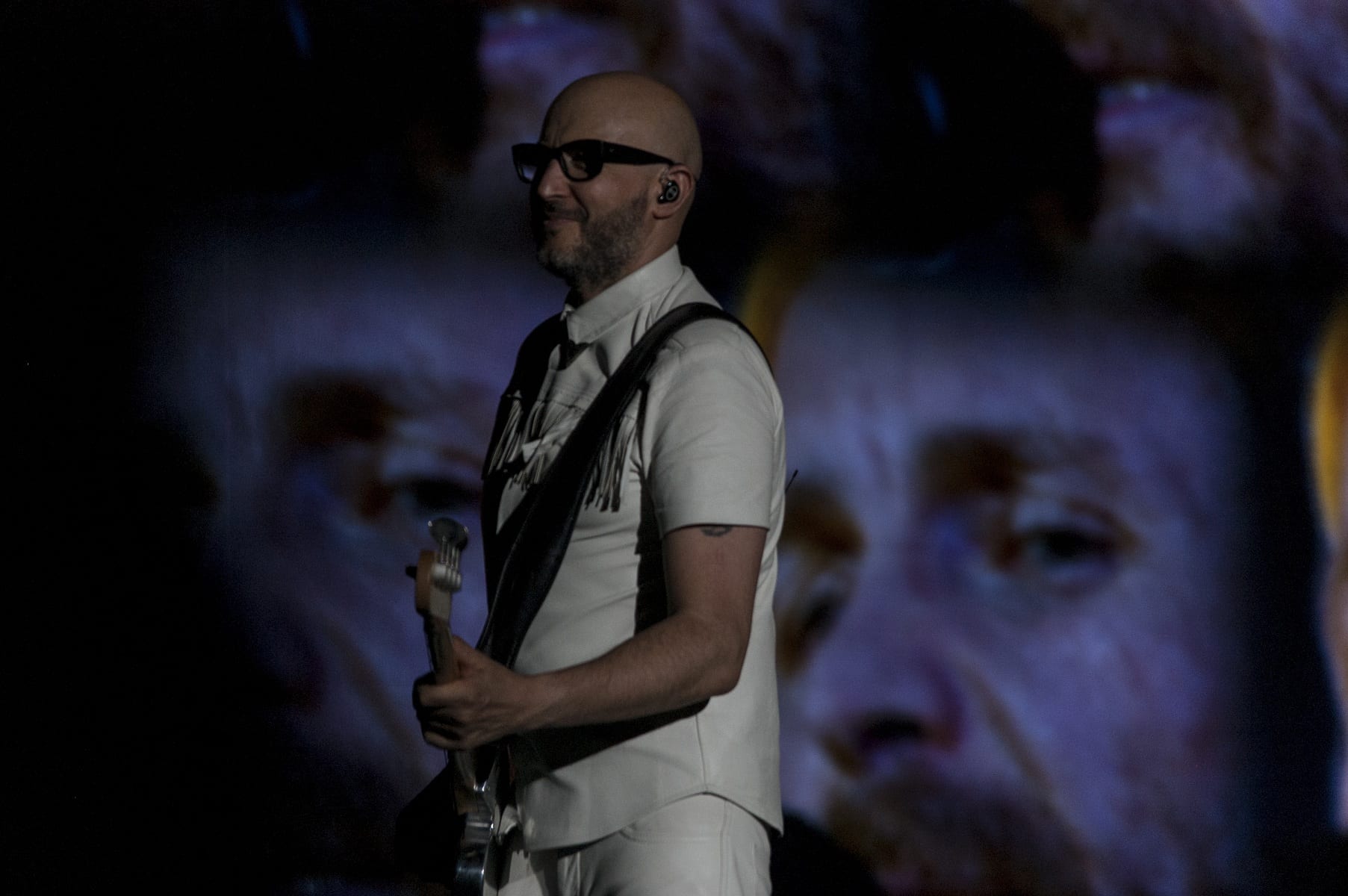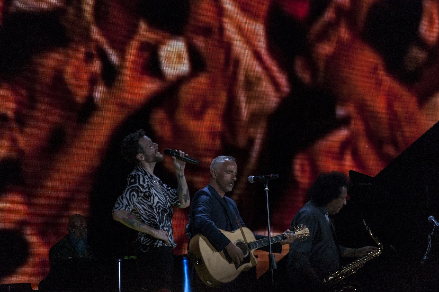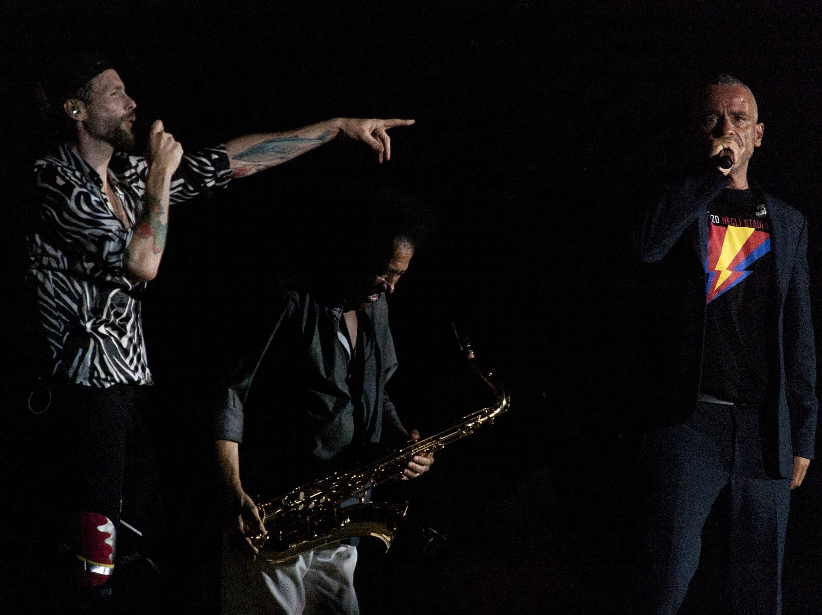 Eros Ramazzotti perde, per un attimo, il tempo sulle note di “Napule è” ma l’emozione traspare dal maxi-schermo del palco, la voce rotta dall’emozione sulle note di “Quanno Chiove” e via con “A me me piace ‘o blues”, saluta tutti, mentre le magliette del tour del ’94 sventolano: “Napule è Pino Daniele, ti voglio bene Pinuccio”. Ma lo show non è finito, arriva il momento romantico-melodico con “Estate”, “Le tasche piene di Sassi”, “L’Astronauta”, “Serenata Rap”, “Come musica” e via con “Tutto l’amore che ho” e “La notte dei desideri”. Stop.