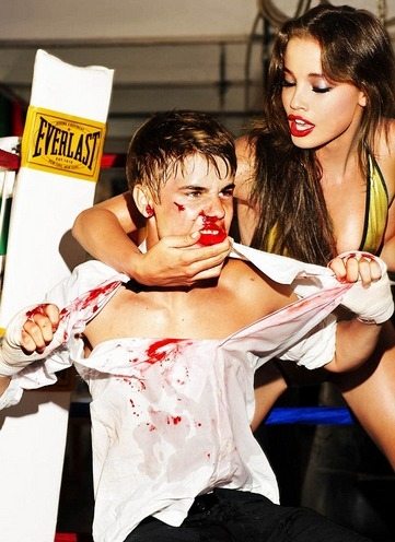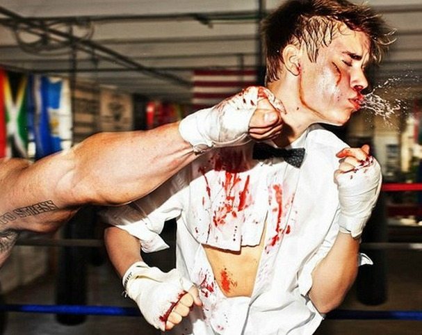 Una scelta di certo particolare questa promossa dal giovane cantante che sembra volersi ritagliare uno spazio diverso da quanto precedentemente gli è stato etichettato: dopo aver detto di voler interpretare un ruolo cruento in un film horror, Justin si dà alla boxe prendendo cazzotti a non finire. Le ipotesi possono sprecarsi: forse un viso pieno di tagli e tumefatto è davvero l’antitesi dell’immagine acqua e sapone costantemente proposta da Justin. Lui stesso ha più volte manifestato negli ultimi tempi l’esigenza di apparire diverso e questa sembra proprio la via scelta da Bieber. Sul set fotografico, però, Justin è stato accompagnato da una splendida modella, magari ciò avrà contribuito a far sentire il cantante un pochino meglio per tutte le botte prese?
