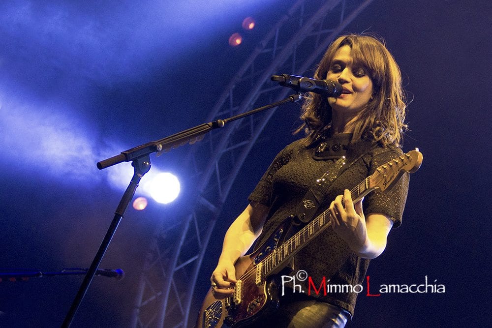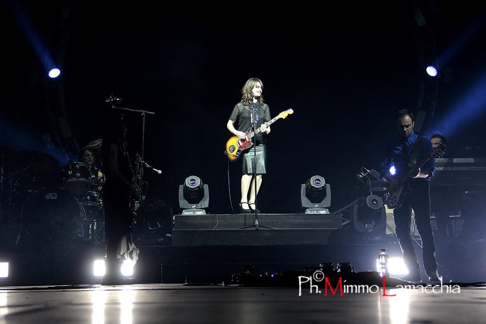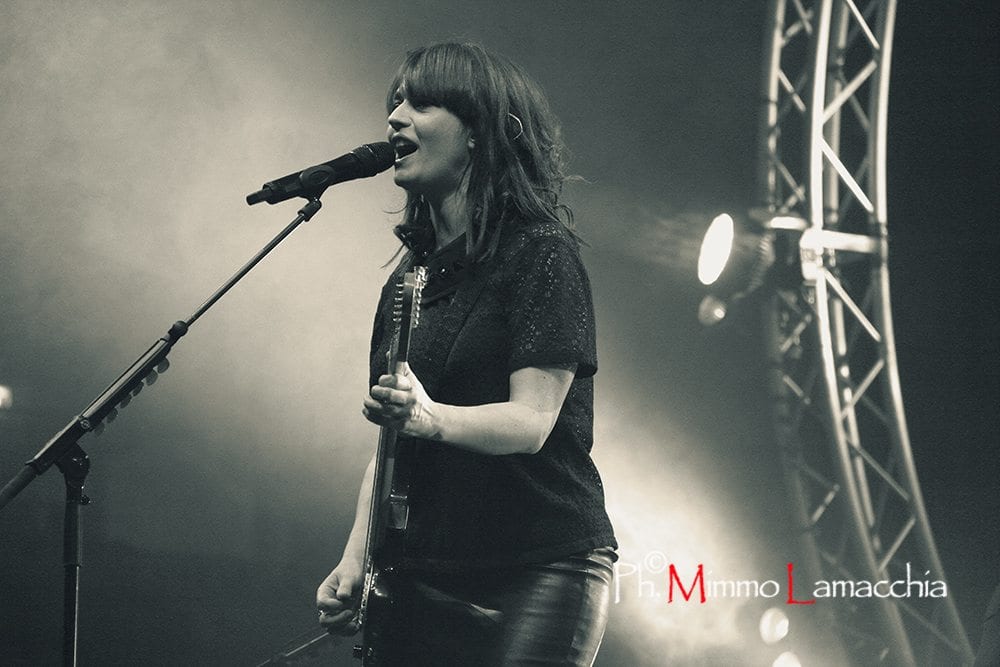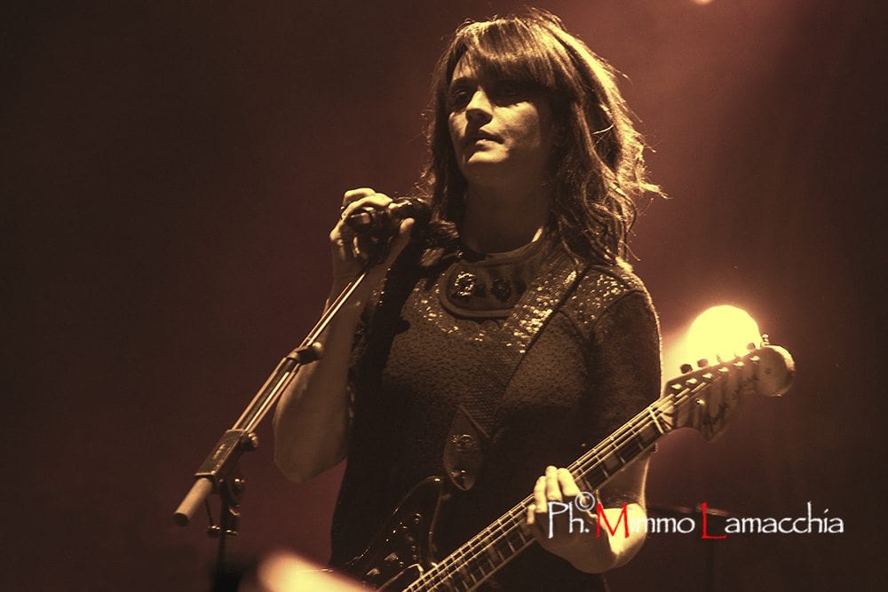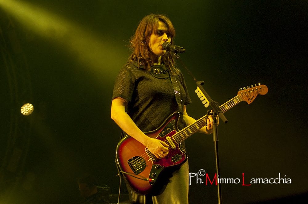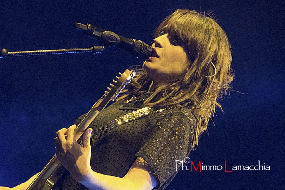 Poco dopo le 21, si son spente le luci e i musicisti hanno fatto il loro ingresso sul palco, dominato dalla presenza scenica della bassista Luciana Luccini, illuminata dall’alto solo con un fascio di luce. Subito dopo tra gli applausi e il boato generale è entrata in scena Carmen Consoli, vestita in total black con tacchi vertiginosi e abbracciando la sua immancabile chitarra, interpretando il brano “La signora del quinto piano” tratto dal suo ultimo lavoro “L’abitudine di tornare” un album che segna il ritorno on stage della Cantantessa. L’inizio del live è scoppiettante, seguono “Per niente stanca” e “Besame Giuda” con la Consoli in splendida forma, libera nella sua innata anima rock, avvolgente e passionale con quella vena poetica, che emoziona e coinvolge, forse statica sul palcoscenico, ma sempre profonda e di corsa nel cuore.