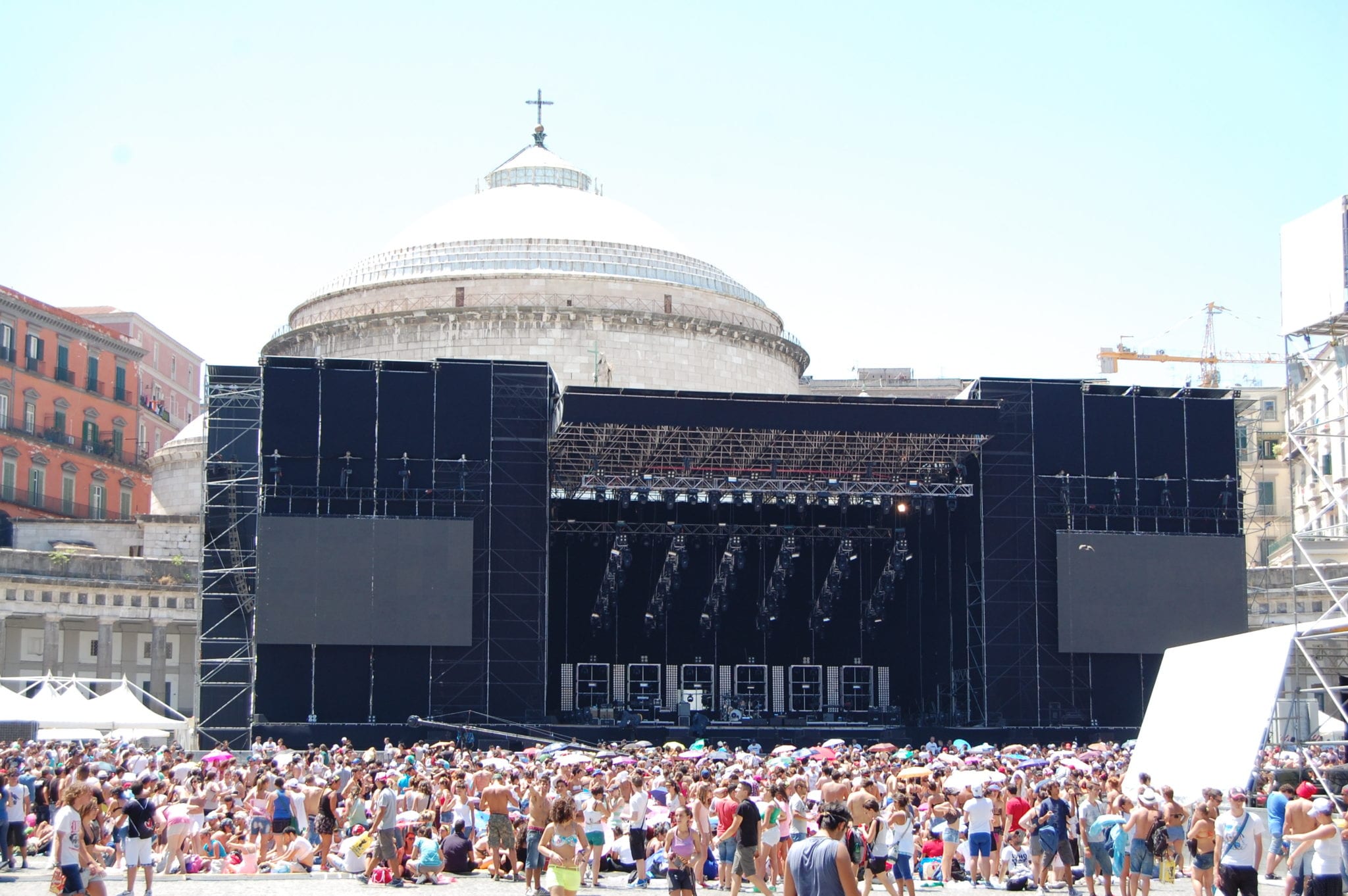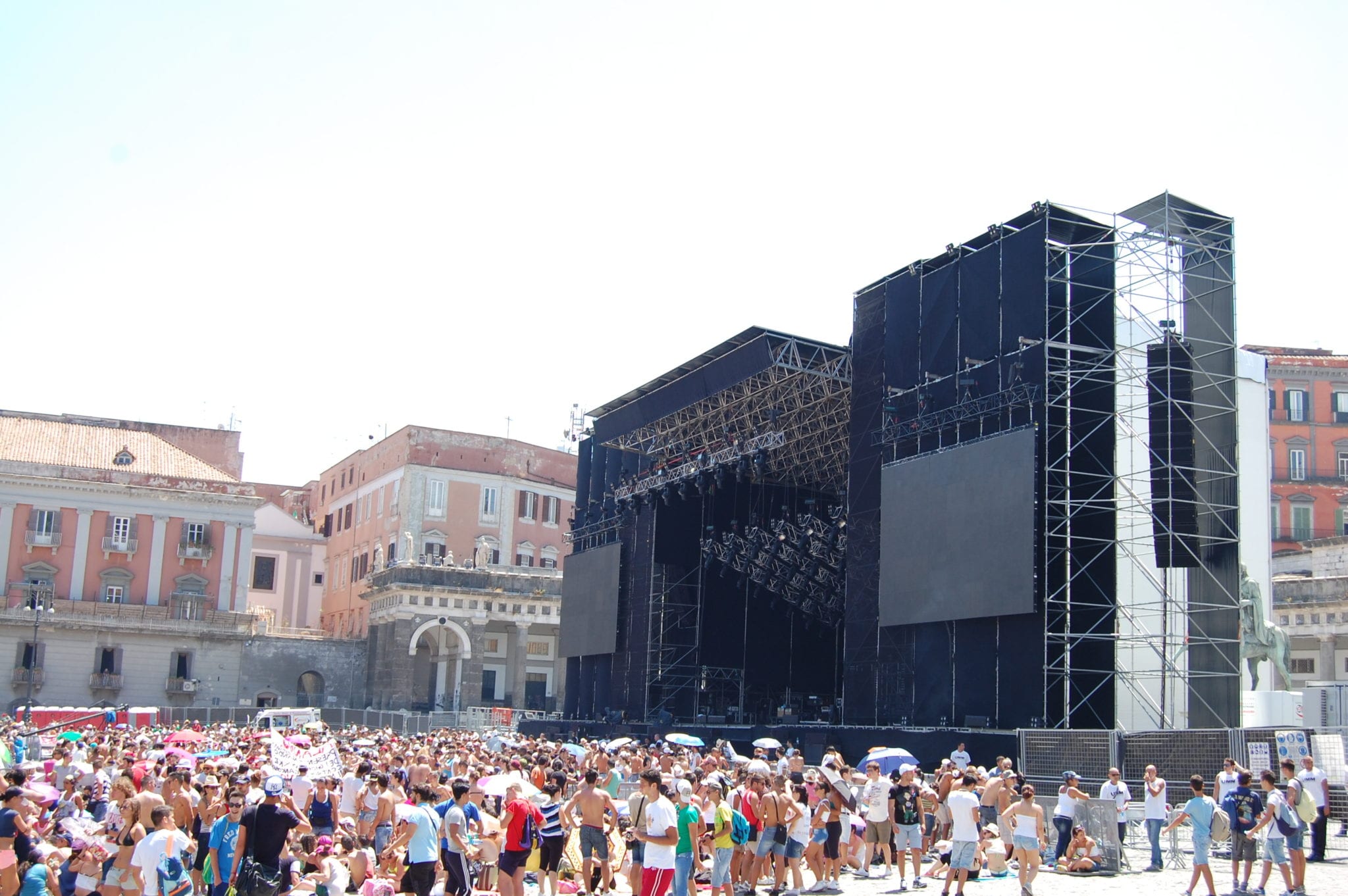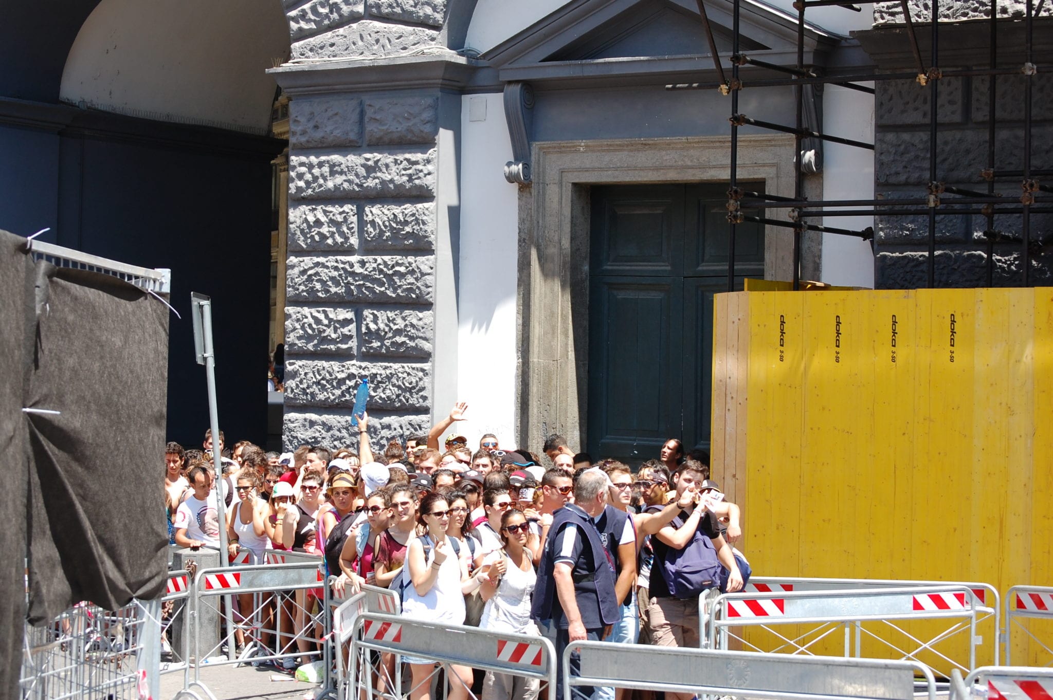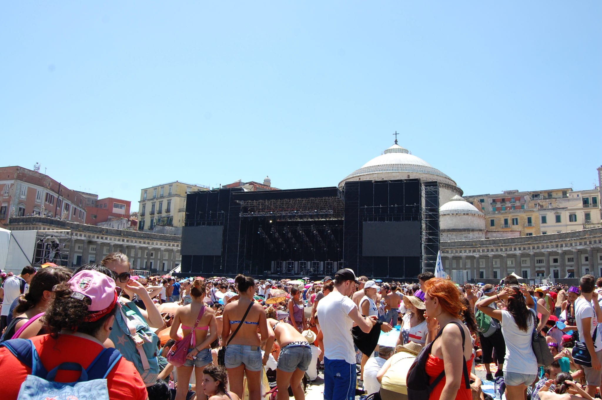 Il pubblico (i fan sono in larga maggioranza) affollano lo spazio antistante Piazza del Plebiscito già dalle prime ore del mattino; per l’occasione è stata disposta una fila a serpentone che dall’ingresso della Piazza supera l’entrata del Teatro San Carlo. Si contano almeno 10.000 persone già in fila che letteralmente assalgono gli uomini della sicurezza che alle 13:00 precise aprono i cancelli per permettere il corretto flusso delle persone. La Piazza a mano a mano si riempe e sotto questo caldo sole di fine Luglio gli addetti si armano di idranti per concedere un pò di refrigerio al pubblico che gradisce. C’è chi si accomoda per mangiare un panino, chi per scattare qualche foto ricordo, chi si affanna per acqusitare le magliette del merchandise ufficiale chi si bagna continuamente la testa chi si spalma la crema solare per evitare ustioni. Lo scenario è sublime, sembra di essere al mare con tanto di ombrellini aperti anche se in pieno centro città. Persone accorse da tutta Italia si concedono una passeggiata in città prima di varcare la soglia dell’entrata di Piazza del Plebiscito mentre i fan più affezionati si ammassano per raggiungere il posto in prima fila.