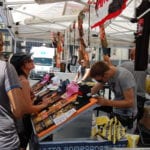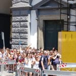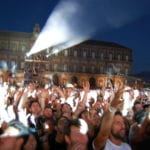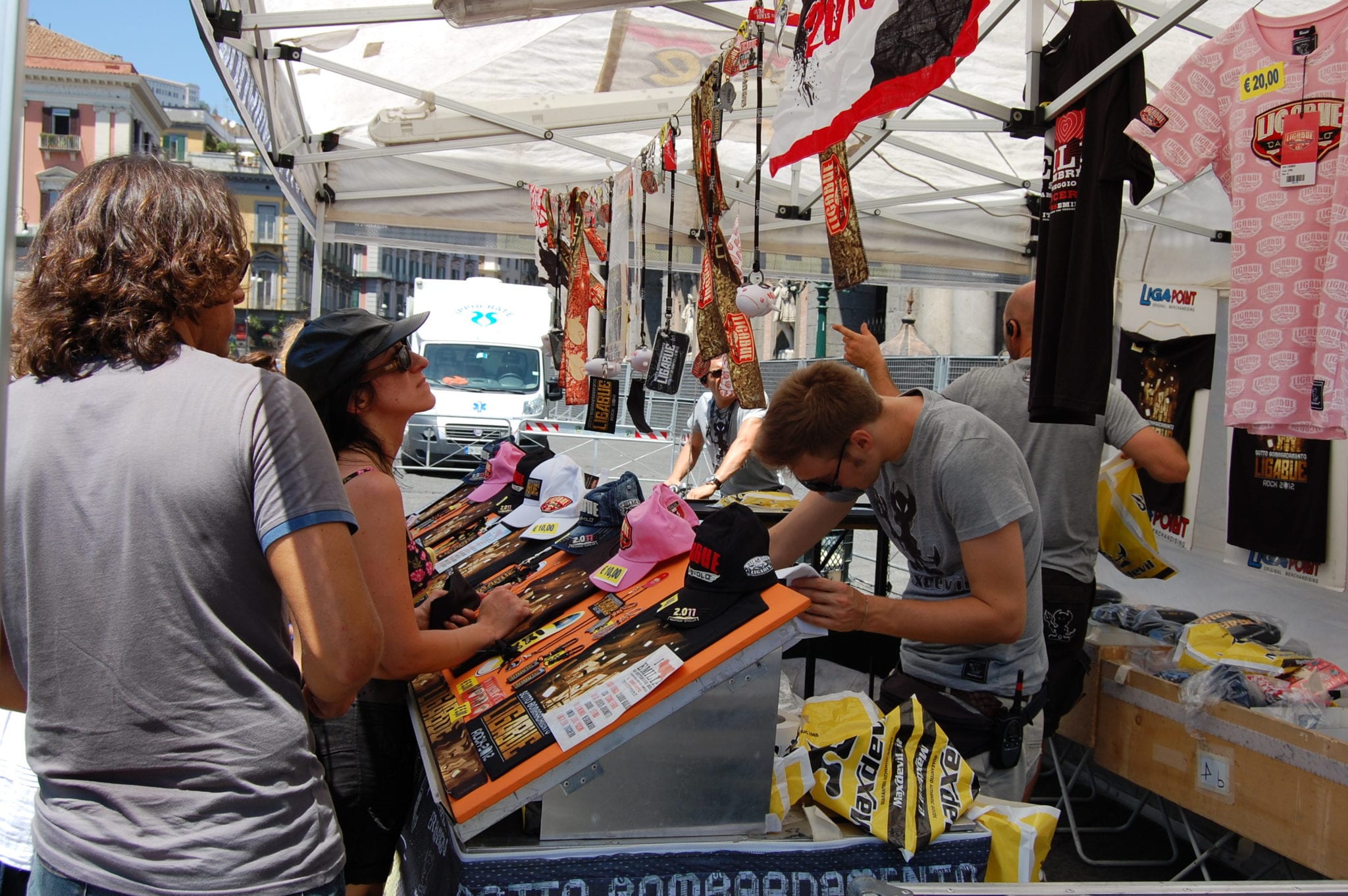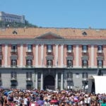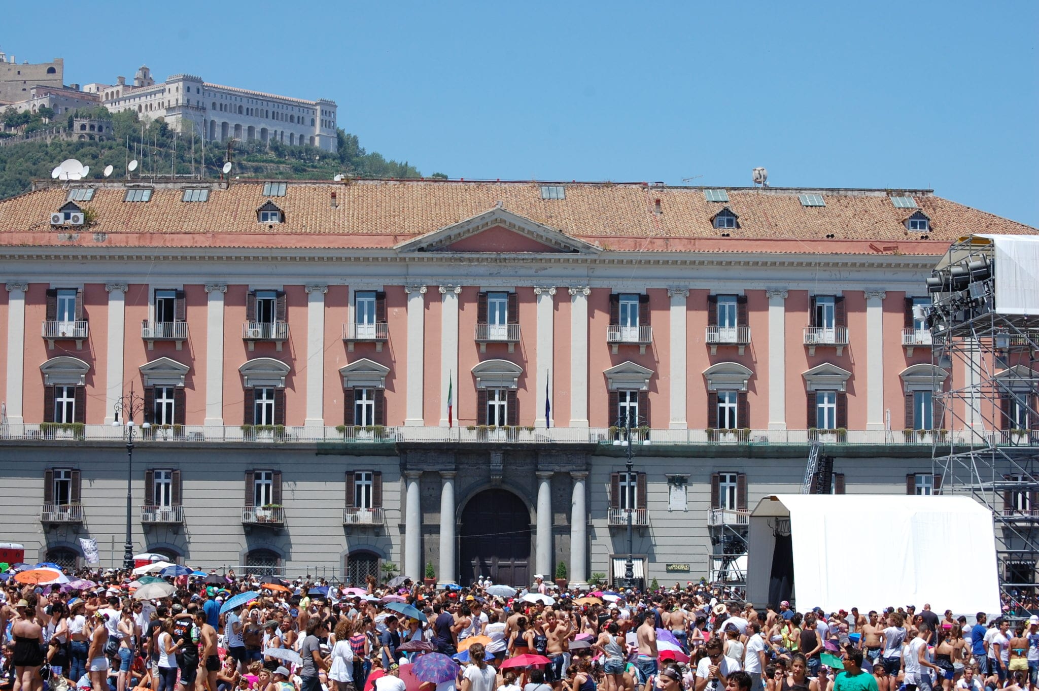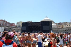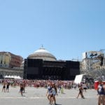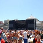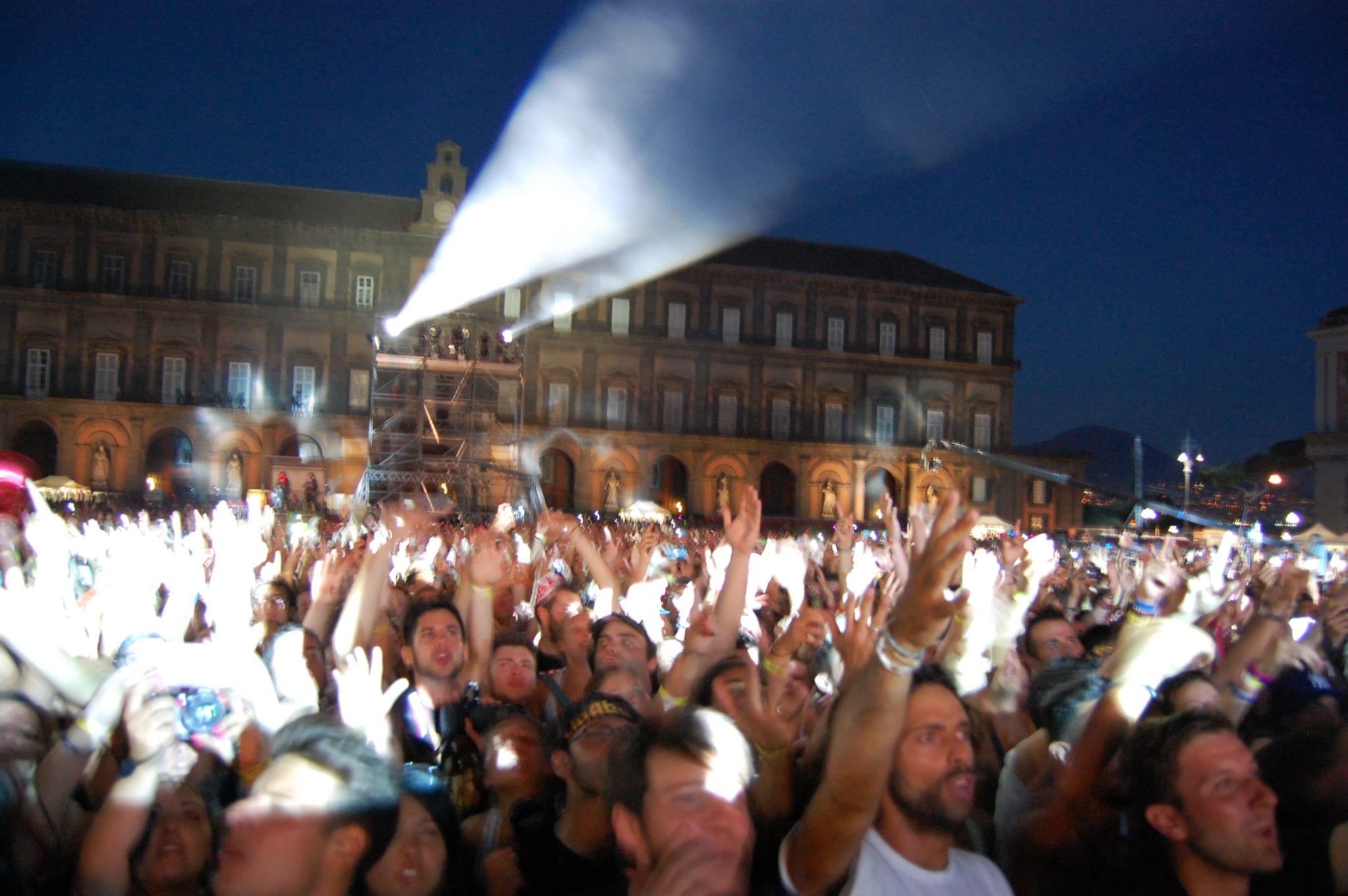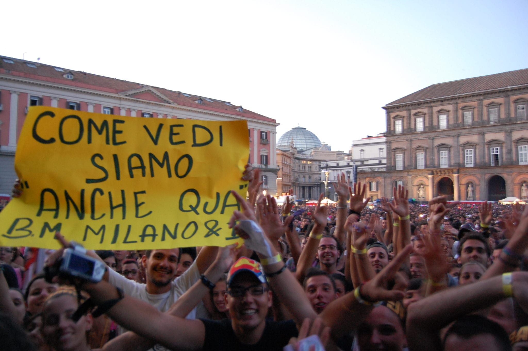 Il pubblico (i fan sono in larga maggioranza) affollano lo spazio antistante Piazza del Plebiscito già dalle prime ore del mattino; per l’occasione è stata disposta una fila a serpentone che dall’ingresso della Piazza supera l’entrata del Teatro San Carlo. Si contano almeno 10.000 persone già in fila che letteralmente assalgono gli uomini della sicurezza che alle 13:00 precise aprono i cancelli per permettere il corretto flusso delle persone. La Piazza a mano a mano si riempe e sotto questo caldo sole di fine Luglio gli addetti si armano di idranti per concedere un pò di refrigerio al pubblico che gradisce. C’è chi si accomoda per mangiare un panino, chi per scattare qualche foto ricordo, chi si affanna per acqusitare le magliette del merchandise ufficiale chi si bagna continuamente la testa chi si spalma la crema solare per evitare ustioni. Lo scenario è sublime, sembra di essere al mare con tanto di ombrellini aperti anche se in pieno centro città. Persone accorse da tutta Italia si concedono una passeggiata in città prima di varcare la soglia dell’entrata di Piazza del Plebiscito mentre i fan più affezionati si ammassano per raggiungere il posto in prima fila.