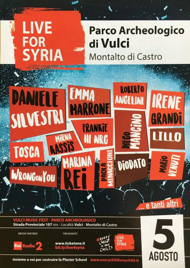 Molto di più di un concerto quello che si è svolto nella giornata al Parco Archeologico di Vulci per il “Live for Syria“, una manifestazione organizzata per raccogliere fondi per i bambini della Siria colpita dalla guerra.
