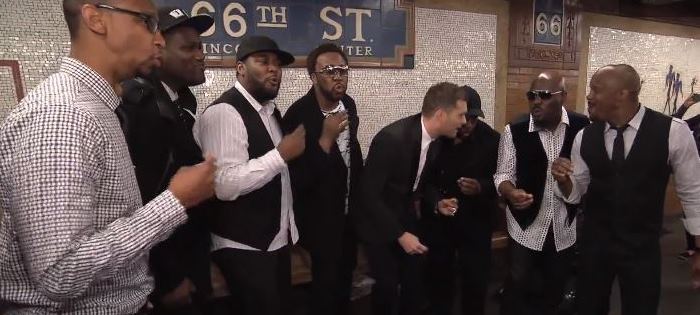 Michael Bublé ha realizzato uno show a sorpresa molto interessante e senza dubbio particolare. Il cantante canadese ha infatti organizzato a sorpresa una show nella metropolitana di New York. Ebbene sì, i passeggeri della metropolitana durante la mattinata del 26 Aprile 2013 hanno potuto godere di uno spettacolo indotto proprio da Bublé, come solito elegantissimo vestito con un completo nero; assieme a lui i Naturally 7, un gruppo di sette voci maschili dalle tonalità profondamente black. Di certo un po’ di invidia per gli abitanti di New York è più che lecita ma grazie alla tecnologia possiamo comunque ammirare lo spettacolo improvvisato visto che alcuni ignari passeggeri hanno avuto la prontezza di riprendere Michael Bublé mentre si esibiva con i Naturally 7.