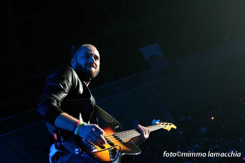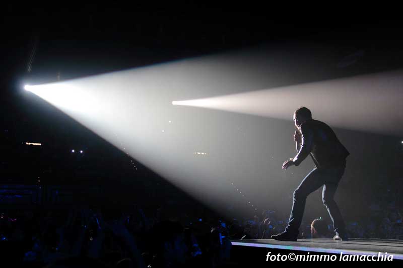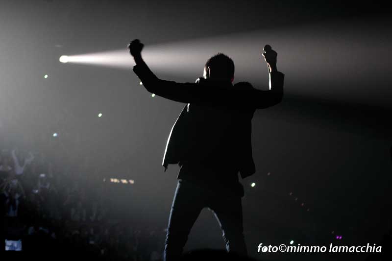 Sulle note di “Gioia” ha inizio il concerto, la band fa il suo ingresso sul palco che si apre con tre pedane che arrivano tra il pubblico, quasi al centro del palazzetto, proprio per stabilire ancora di più quel contatto empatico che lega i Modà ai suoi fan.
