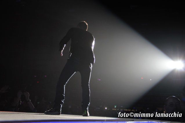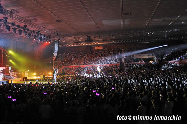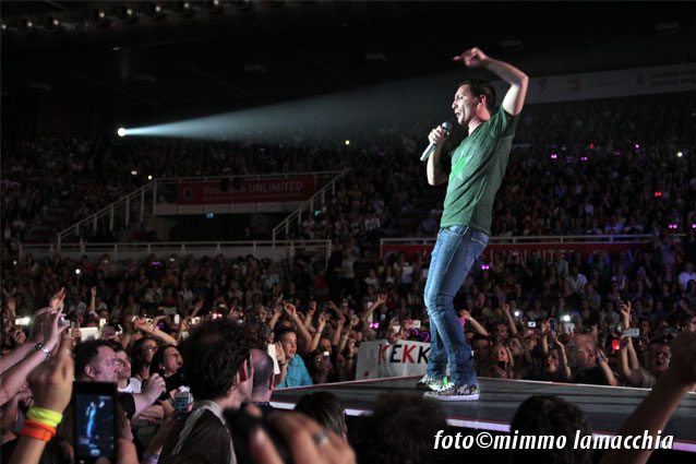 Si spengono le luci e sulle note di “Gioia” comincia il concerto. Il palazzetto esplode letteralmente in un boato di ovazione mentre la band sale sul palco con il pubblico in delirio e Kekko che si gode da subito i suoi fan, correndo e cantando lungo le tre pedane create per arrivare tra la gente.