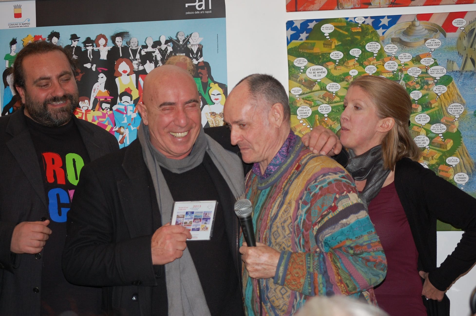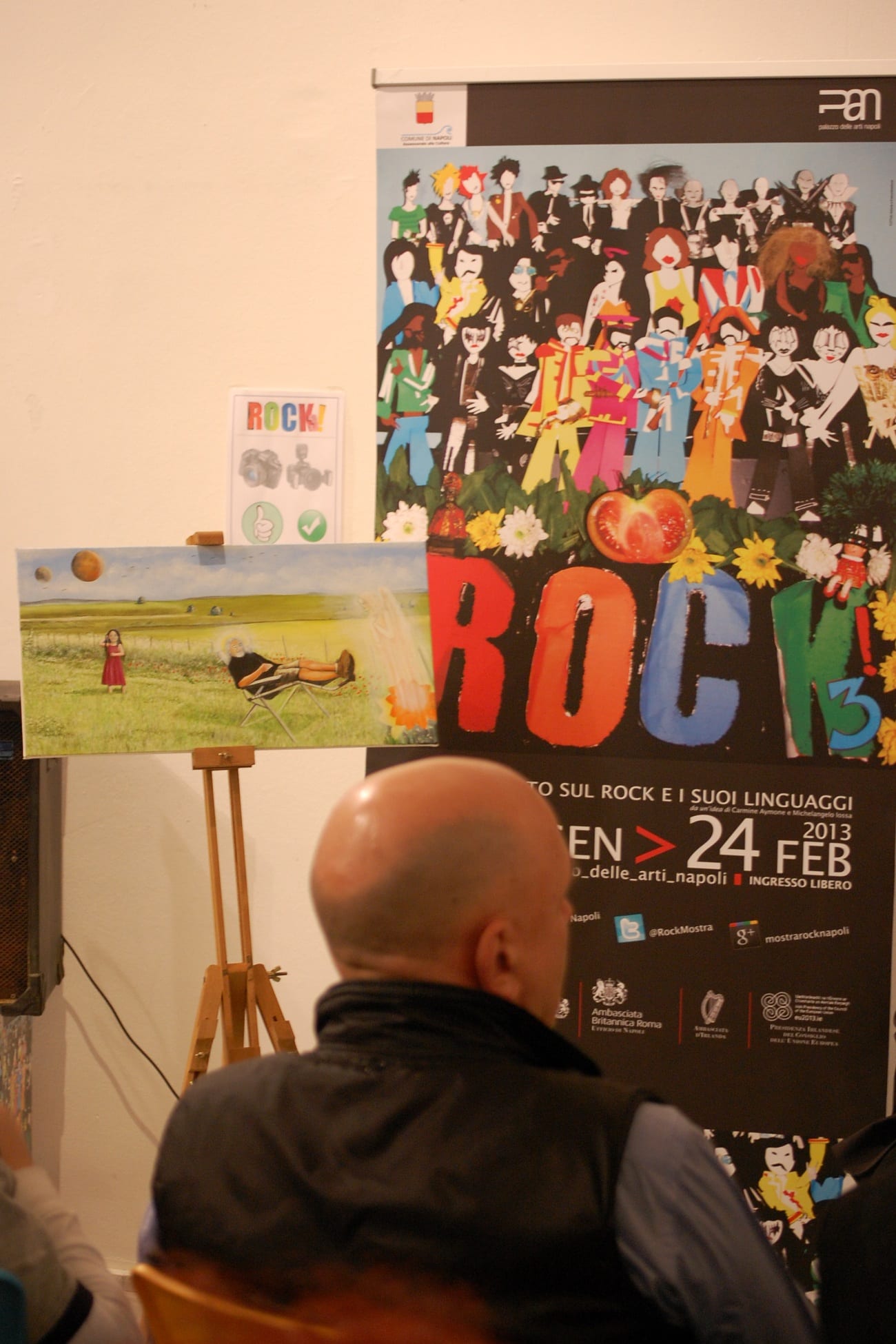 Il pubblico si aggira curioso tra le sale al primo piano del PAN|Palazzo delle Arti di Napoli mentre fugace è la preparazione della sala che ospiterà Paul Whitehead con pubblico annesso: non è scontata la scelta della location (la sezione celebrativa i 50 anni dalla creazione dei sintetizzatori MOOG, sezione in cui trovano spazio anche le opere di Paul Whitehead); durante l’incontro lo stesso autore ha avuto modo di mostrare e guidare gli spettatori lungo le proprie creazioni, una sorta di lezione interattiva. L’evento è stato realizzato in collaborazione con Italstage, mediato dai curatori ed ideatori della Mostra ROCK!3 – Michelangelo Iossa e Carmine Aymone, con la presenza di Lino Vairetti (frontman degli Osanna che consegna nelle mani di Whitehead una propria creazione scolpita ad hoc per l’occasione) e il giornalista Donato Zoppo, studioso italiano del fenomeno prog-rock nonchè autore di numerosi testi dedicati al genere di riferimento.