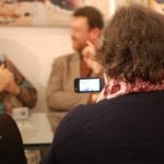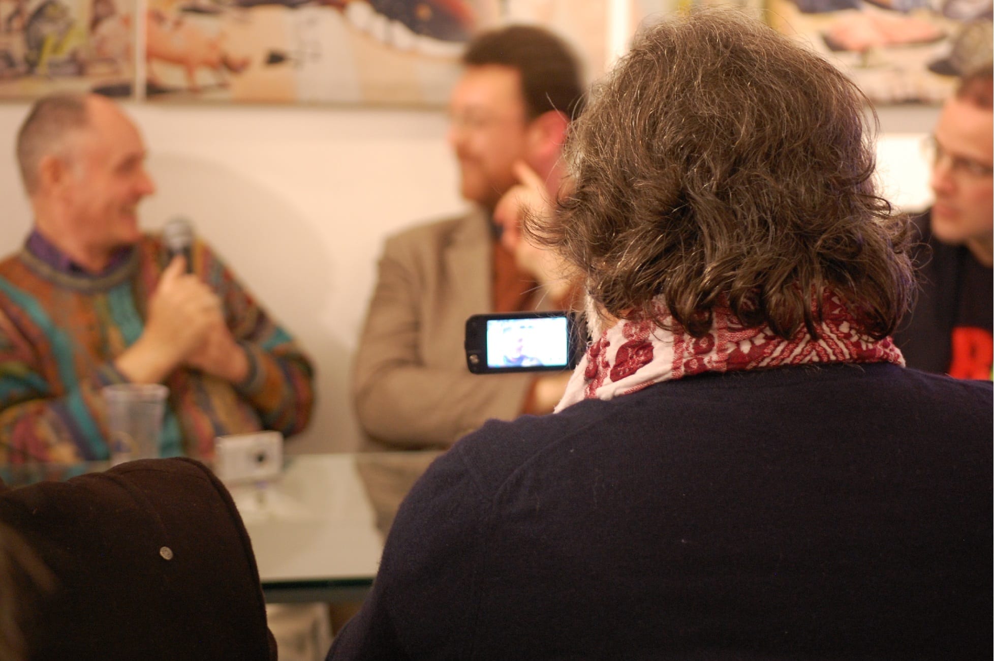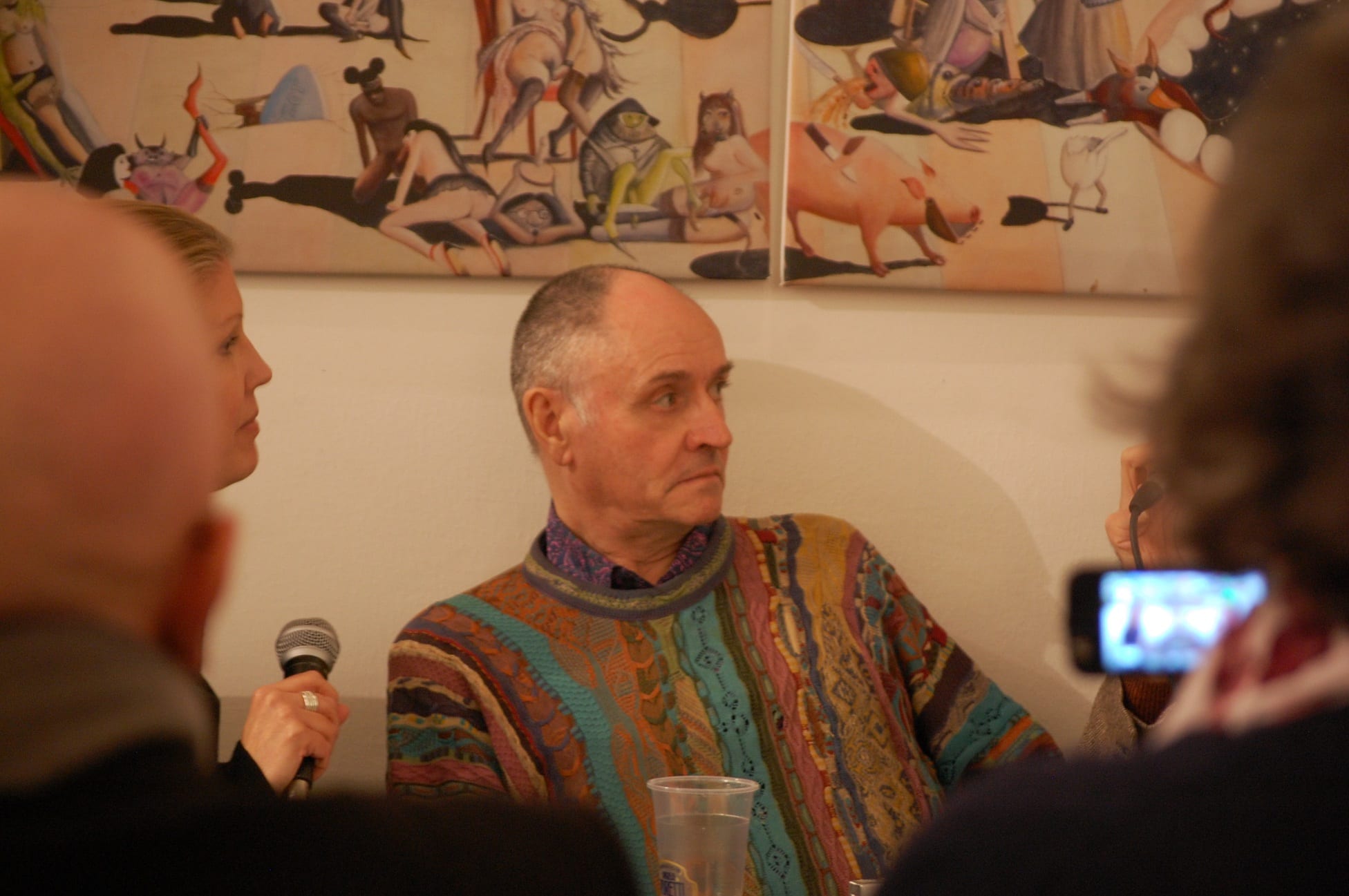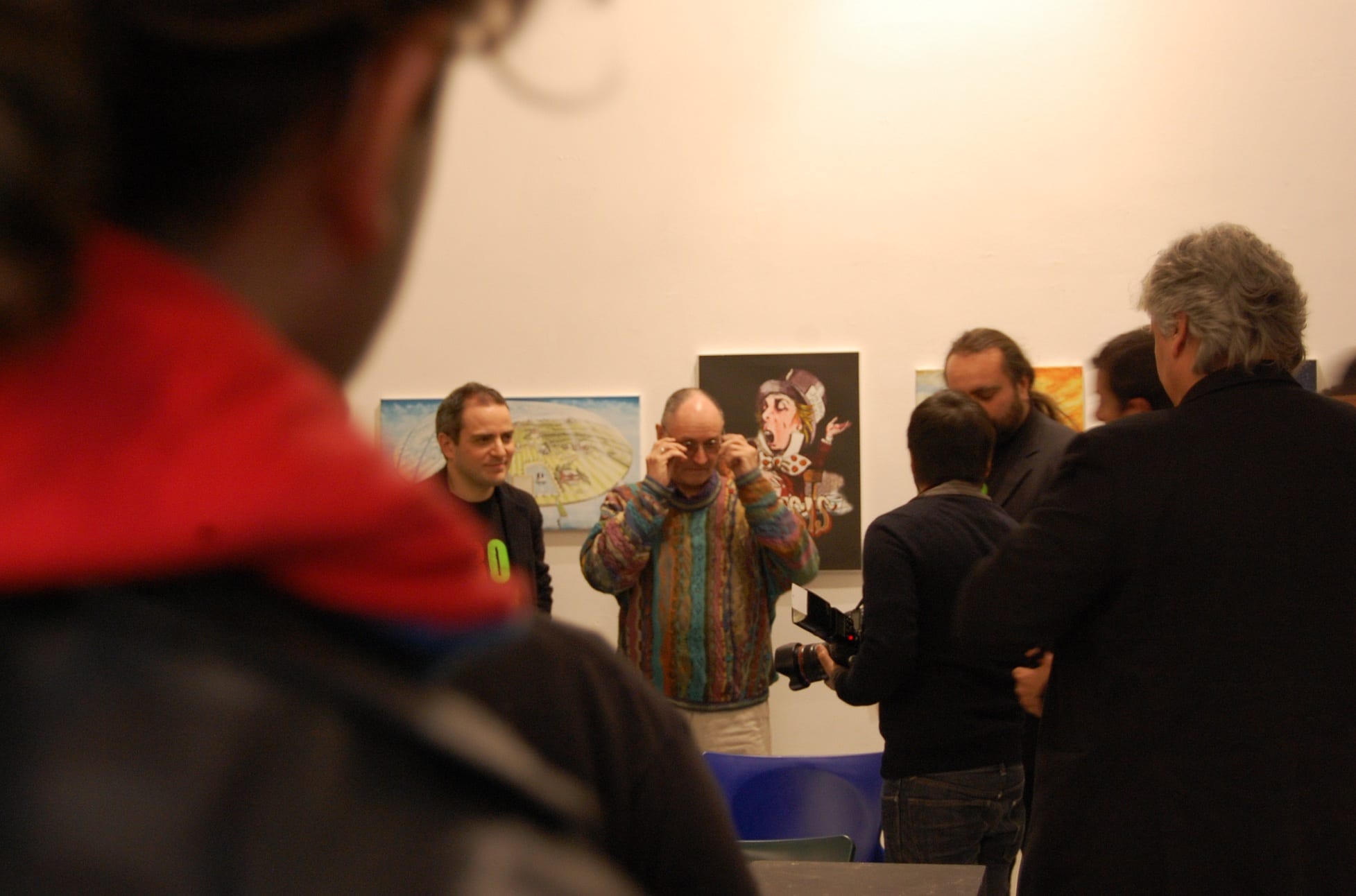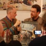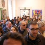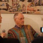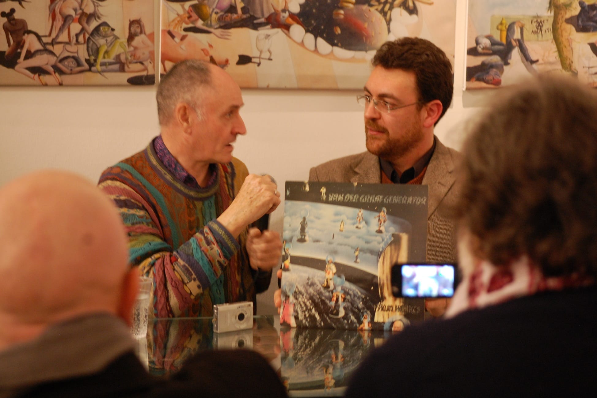 Interviste e foto di rito come da consuetudine, la parola a Carmine Aymone che fa spalla con Michelangelo Iossa: presentazione ufficiale, ringraziamenti e partecipazioni, intervento del giornalista Donato Zoppo, consegna del premio ‘Rock Legends‘, domande dei presenti, firma-copia; questa la scaletta. Divertito (a tratti incredulo) per l’affluenza di persone che ieri hanno preso d’assalto le sale al primo piano del PAN, Paul Whitehead racconta le creazione che hanno segnato album destinati a diventare immortali: per i Genesis le 3 copertine (tra l’altro in esposizione) sono “Trespass”, “Nursery Crime” e “Foxtrot”; curioso l’aneddoto circa la copertina di “Trespass”: entrato in contatto con i Genesis alla mera età di 23 anni, Peter Gabriel rovesciò completamente i contenuti dell’album, rendendoli più forti, dunque la copertina non era più adatta per l’occasione: aveva bisogno di qualcosa di più “cattivo”. Una discussione tra i due portò Peter Gabriel ad afferrare un coltello effettuando un’incisione su tutta la tela, in trasversale: quel coltello fu ripreso da Paul Whitehead di sana pianta, ed ecco la copertina di “Trespass” dai contenuti più strong rispetto quelli preventivati. Anche i Vand Der Graaf Generator non passano di certo in secondo piano: l’autore analizza la copertina di “Pawn Hearts” con il giornalista Donato Zoppo in questo gioco di contrapposizioni tra due mondi completamente differenti (Genesis e VDGG) ma con un massimo comun divisore.