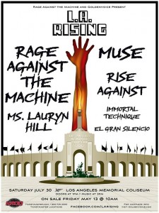 I Muse hanno confermato, tramite un messaggio su twitter, i rumors che li volevano sul palco insieme ai Rage Against the Machine all’ L.A.Rising festival di Los Angeles. la locandina del festival Attraverso il popolare social network hanno infatti reso noto la data e i nomi degli artisti con i quali divideranno il palco: insieme ai Muse e ai Rage Against theMachine, il 30 Luglio a Los Angeles, ci saranno Rise Against, Immortal Technique, El Gran Silencio e, ultima e non certo per importanza, Lauryn Hill. Location dell’evento il Los Angeles Memorial Coliseum. I biglietti, con prezzi da 69 e 99 dollari saranno in vendita a partire da venerdì 13 Maggio. Per altri dettagli c’è sempre la pagina facebook ufficiale .