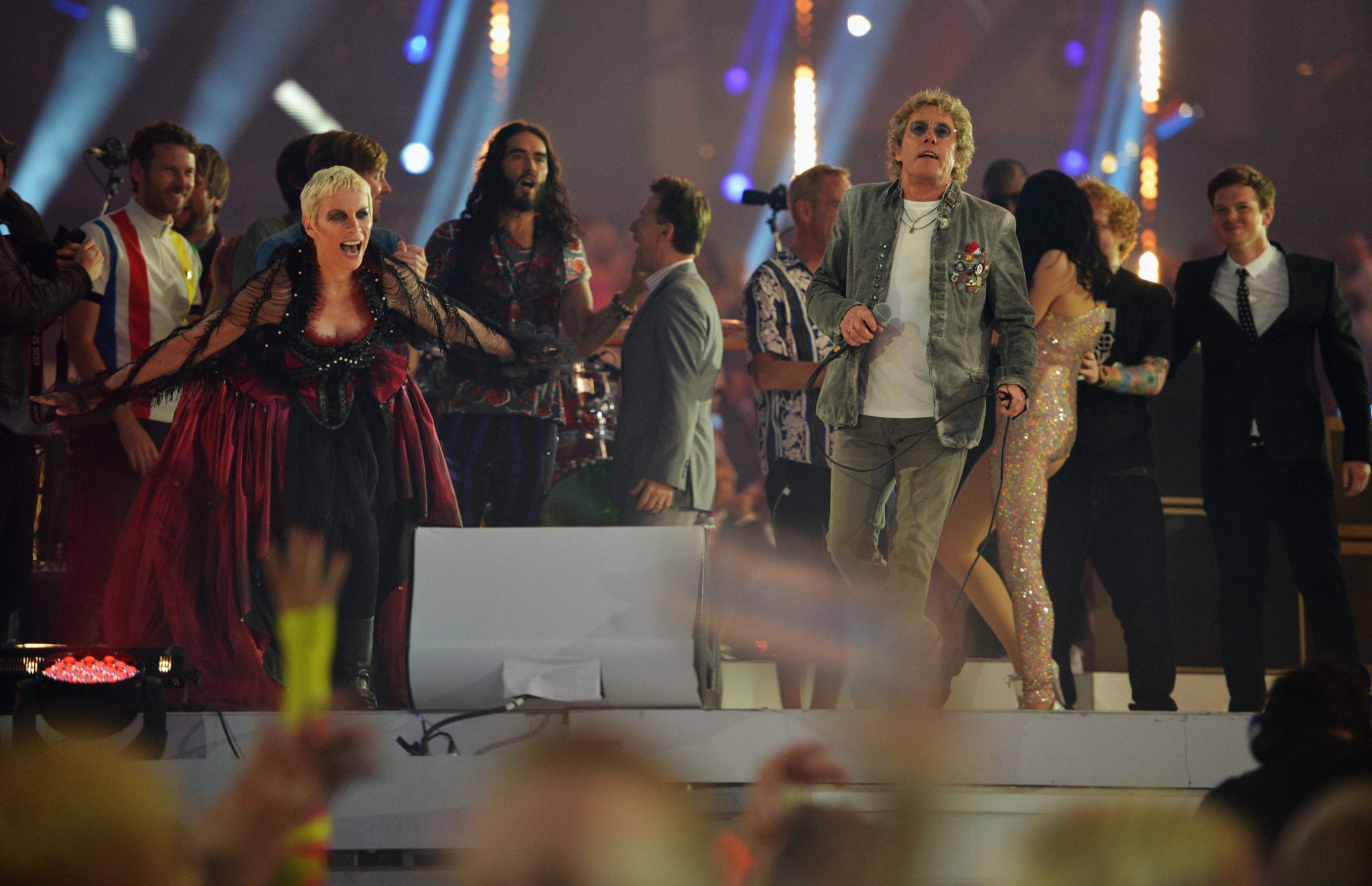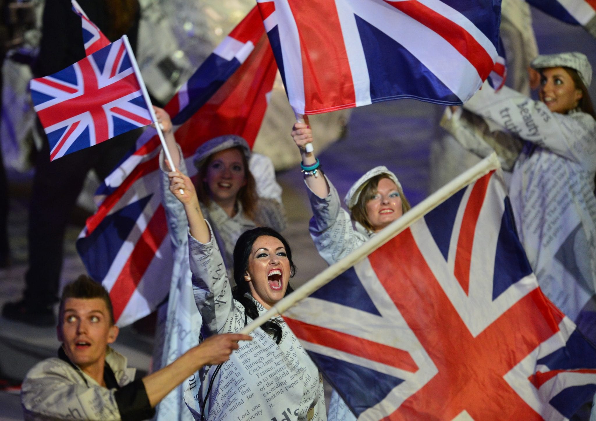La Union Jack accoglie le stupende modelle inglesi, come Kate Moss, immancabile e già ampiamente annunciata. E’ il momento dell’intensità di Annie Lennox che entra accompagnata da un galeone sulle note di “Babybird”: la mezz’ora seguente è un tripudio di performance e nomi, passando da Ed Sheeran, con Nick Mason nonché Russell Brand, Fatboy Slim e la performance di Jessie J. La accompagnata da Tinie Tempah. Subito dopo è la volta di Taio Cruz. La performance dance si conclude con l’arrivo delle Spice Girls in un revival che viene molto amato dal pubblico. Solo qualche minuto per loro ed ecco il momento dei Beady Eye con la voce di Liam Gallagher che intona “Wonderwall”. Eric Idle propone una versione rivisitata di Monty Python “Always Look on the Bright Side of Life” con tanto di coreografie molto intense: pantomima, suore che ballano sui pattini e altri balletti.