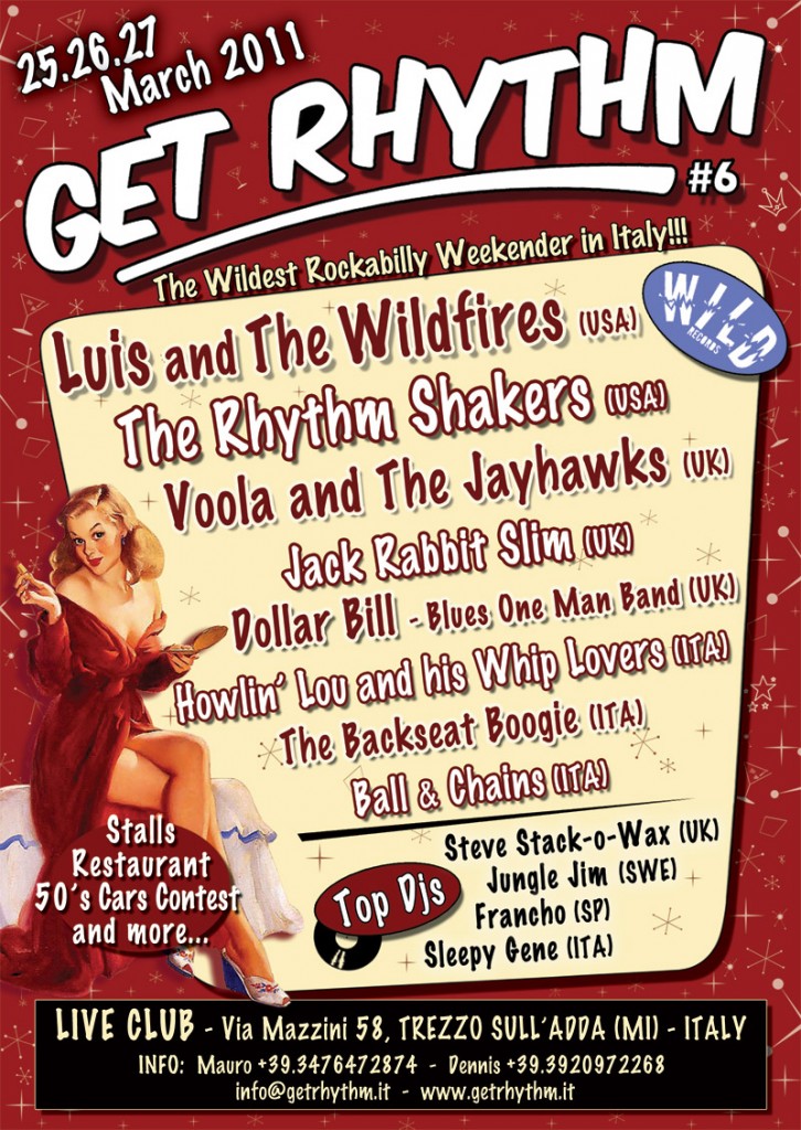 Parte ufficialmente stasera la sesta edizione del Get Rhythm, il più incredibile festival Rockabilly del nostro Paese. Sarà un pre-party all’Amigdala di Trezzo sull’Adda (MI) a dare il via ufficiale alla manifestazione che vedrà, per tutto il weekend, un susseguirsi di band internazionali della scena rockabilly mondiale incorniciate da automobili anni 50, brillantina e cucina tipica. Si parte alle ore 21:00 di stasera, 25 Marzo con dj set. Alle 22 saliranno sul palco gli italiani Howlin’ Lou and His Whip Lovers, seguiti alle 23.30 dagli inglesi Dollar Bill (Blues One Man Band) e dagli americani the Rhythm Shakers che chiuderanno con uno show di un’ora a partire dalle 0.45. A seguire dj set di Dj Steve stack-o-wax fino a tarda notte. Il tutto con un biglietto di ingresso di soli 10 euro. Il manifesto dell'evento Sabato 26 Marzo, il festival partirà dalle ore 13 con musica live nel giardino del Live di Trezzo sull’Adda e pranzo italiano a base di spaghetti, vino e caffé. Musica affidata a dj Sleepy Gene (ITA) e poi al live dei Ball & Chains, che si esibiranno intorno alle 18.30. La sera, di nuovo grande musica dal vivo: dalle 22, sempre sul palco del Live, Jack Rabbit Slim, Voola and the Jayhawks e Luis and the Wildfires. Prezzo della serata: 17€ Domenica 28, relax in giardino con brunch di arrivederci, mostra di auto anni 50 a cura di Cruisin Life Magazine, concerto (alle 18) dei the Backseat Boogie, jam session e dj set a sfumare con la possibilità di mettere i propri dischi. Biglietto giornaliero 5 euro. Disponibile anche un biglietto cumulativo per l’intero festival al prezzo speciale di 28€. Per info e prenotazioni: www.getrhythm.it