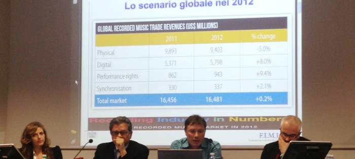 Dopo la parte introduttiva, si passa alla sostanza del Digital Music Report 2013. Il Digital Music Report è uno strumento fondamentale, per gli addetti ai lavori. Redatto dall’IFPI, il report include i risultati emersi da uno studio sui comportamenti di consumo realizzati da Ipos MediaCT e commissionato appunto dall’IFPI (International Federation of the Phonographic Industry). Strumento imprescindibile da alcuni anni, il Digital Music Report è stato redatto anche nel 2013 e i dati sono stati presentati all’interno del workshop. Vediamo quelli più importanti: