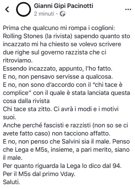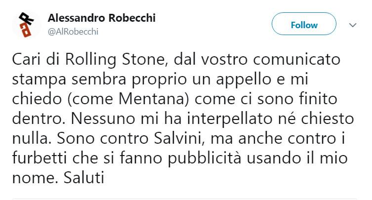 Massimo Coppola, direttore editoriale di Rolling Stone, ha dato una spiegazione all’accaduto, che sembra più che altro un tentativo maldestro di arrampicata sugli specchi. Ha spiegato che “non essendo un appello non ci sono firmatari” e di aver scelto di includere post pubblici di personaggi che fossero d’accordo sul pensiero espresso contro Matteo Salvini. Tra un autogol e i commenti deliranti degli utenti, si può fare appello all’antica formula del “nel bene e nel male, purché se ne parli”.