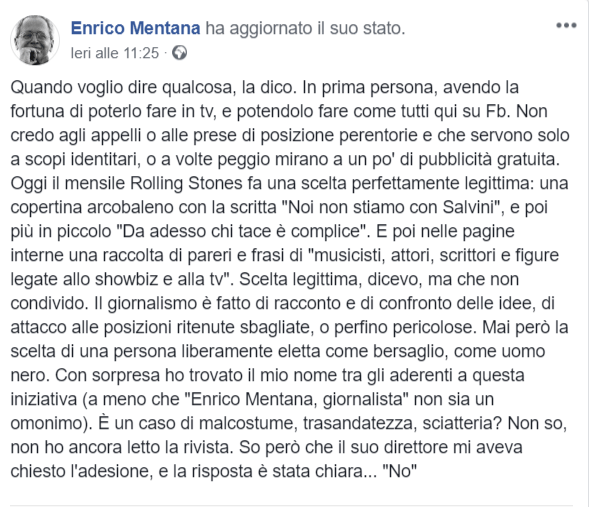 Con sorpresa ho trovato il mio nome tra gli aderenti a questa iniziativa (a meno che “Enrico Mentana, giornalista” non sia un omonimo). È un caso di malcostume, trasandatezza, sciatteria? Non so, non ho ancora letto la rivista. So però che il suo direttore mi aveva chiesto l’adesione, e la risposta è stata chiara… “No”.