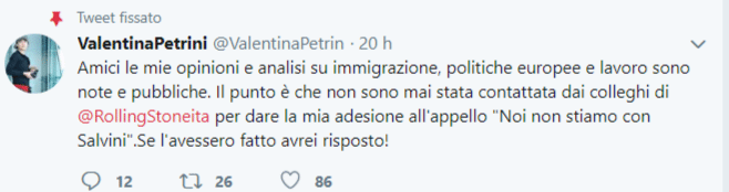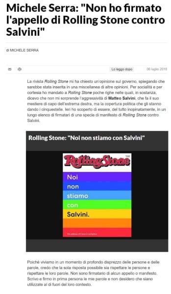 Selvaggia Lucarelli ha parlato di una situazione particolarmente ostile e spesso anche poco regolare per quanto riguarda i contratti di giornalisti e collaboratori. Ma non finisce qui, perché sono emersi i nomi di altre persone inserite nella lista di cui sopra che non avevano scelto di aderire. Tra questi c’è anche la giornalista di “Nemo” Valentina Petrini, che ha dichiarato di non essere mai stata contattata per l’appello della rivista. Idem per il fumettista GiPi, che ha dichiarato di non essere d’accordo col “chi tace è complice”, e per lo scrittore Alessandro Robecchi, che sostiene di non essere mai stato interpellato. Michele Serra su Repubblica ha spiegato di essere stato contattato dalla rivista per dare un’opinione sul Governo ma non per essere inserito “in un lungo elenco di firmatari di una specie di manifesto di Rolling Stone contro Salvini. […] Scrivo e firmo in prima persona le mie parole e non desidero che siano utilizzate al di fuori del loro contesto“.