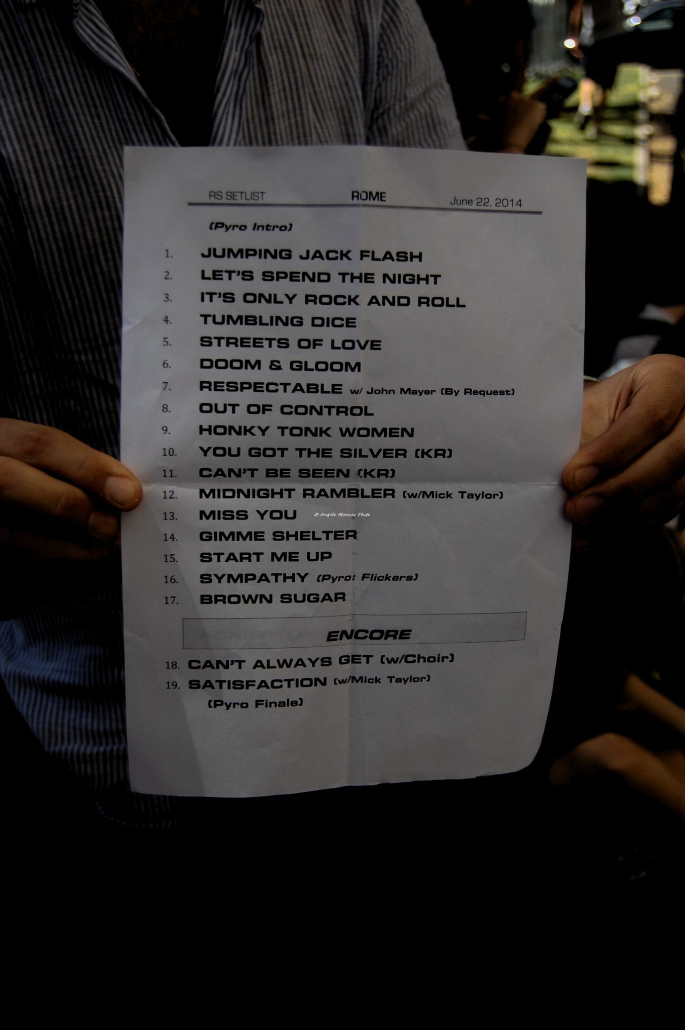 La prima “pausa” arriva sulle note di “Street of Love” dopo che “Let’s spend the night toghter”, “It’s only rock’n’roll” e “Tumbling Dice” non mi hanno neanche dato il tempo di realizzare che su quel palco si stava consumando un evento di portata storica. Poco m’importa anche che abbiano deciso di registrare un DVD, perchè quello che conta sono i vocalizzi del pubblico presente e le braccia protese sul palco, quasi a voler abbracciare quei quattro giovanotti (cinque, contando Mick Taylor) e ringraziarli di tutta la musica che ci hanno regalato. Prima di intonare “Respectable” con John Mayer, scelta dal pubblico di Roma, delude solo un pò “Doom & Gloom” che perde d’intensità rispetto la registrazione in studio, ma se poi gli Stones ti cantano “Out of Control” e “Honky Tonk Woman” allora decidi che li puoi perdonare.