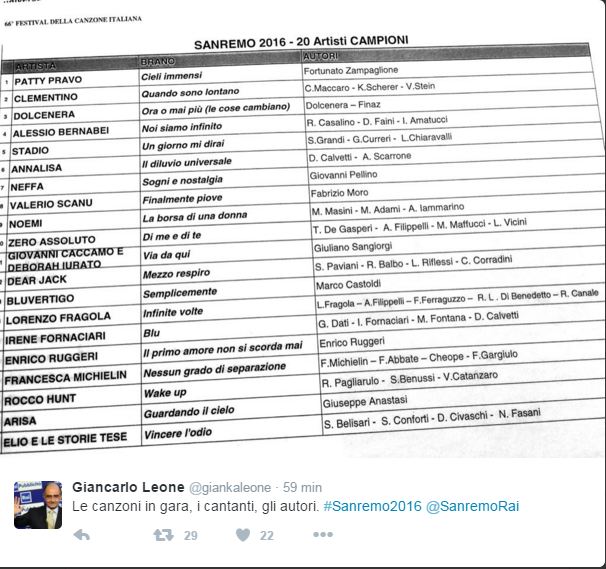 A pubblicare su Twitter la foto della scaletta delle cover scelte dai big è stato il direttore di Rai Uno Giancarlo Leone. La serata dedicata alle cover è quella di Giovedì 11 febbraio.