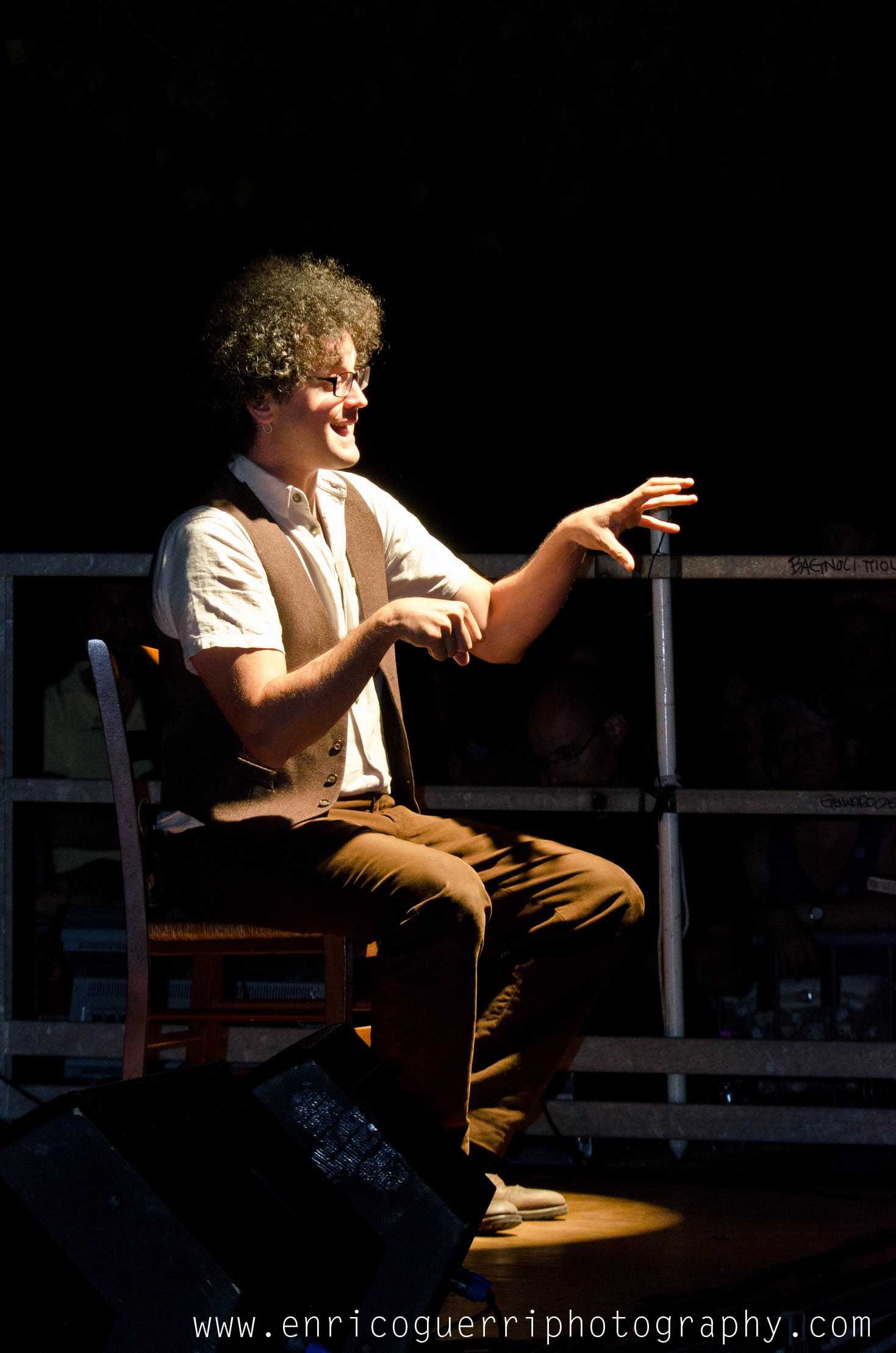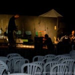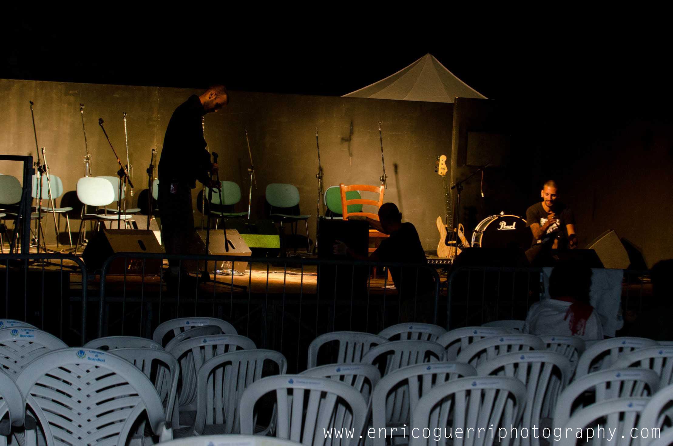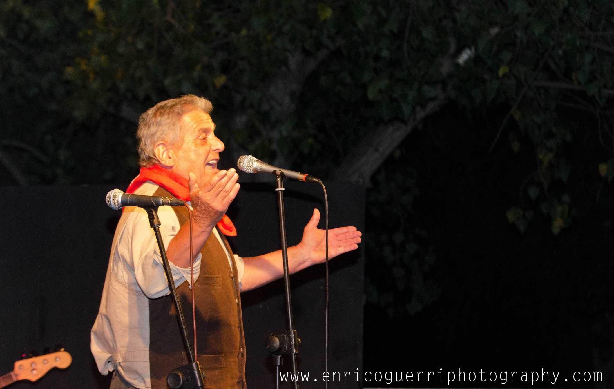 Il pubblico fa un lungo applauso, alcuni borbottano. L’età media è abbastanza alta, ci sono pochi ragazzi/e under 25-30. Le persone che sono arrivate presto e/o abitano vicino si sono accaparrate i posti centrali fronte palco a sedere, alcuni si sono portati la sedia da casa, altri stanno seduti nel prato, altri ancora in piedi. Io invece giro e da rigiro in cerca di una postazione fotografica ad hoc in cui stabilirmi, ma non la trovo e continuo il mio girovagare, laterale al palco lato sx piuttosto che il dx, alle volte dal fondo o altre postazioni incastrate trovate per caso, ma molti non gradiscono che qualcuno si intrufoli e gli soffi il posto e si stabilisca con una reflex, un cannone montato ed un flash che illumina il circostante per aiutare la luce del palco.