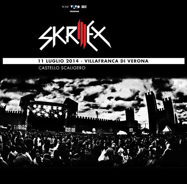 Skrillex sarà al Castello Scaligero di Villafranca l’11 Luglio 2014, le vendite dei ticket cominceranno mercoledì 22 Gennaio 2014 per gli iscritti al Vivo Club, su ticketone la prevendita sarà disponibile a partire dal 23 Gennaio 2014 e per il resto dei circuiti saranno disponibili ticket a partire dal 24 gennaio 2014, inoltre sul sito ticketone in esclusiva sarà possibile acquistare i fan ticket, con la grafica realizzata dallo stesso artista in esclusiva per i suoi fan.