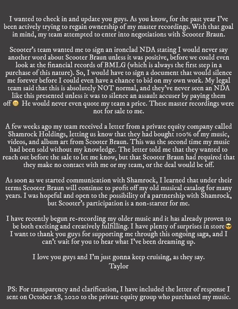 So che questo diminuirà il valore dei miei vecchi master, spero che si capisca che questo è l’unico modo che ho per riguadagnare quel senso di orgoglio che avevo una volta, quando ascoltavo le canzoni dei miei primi sei album. Così permetterò ai miei fan di ascoltarli senza sensi di colpa, per aver dato supporto a Scooter Braun.