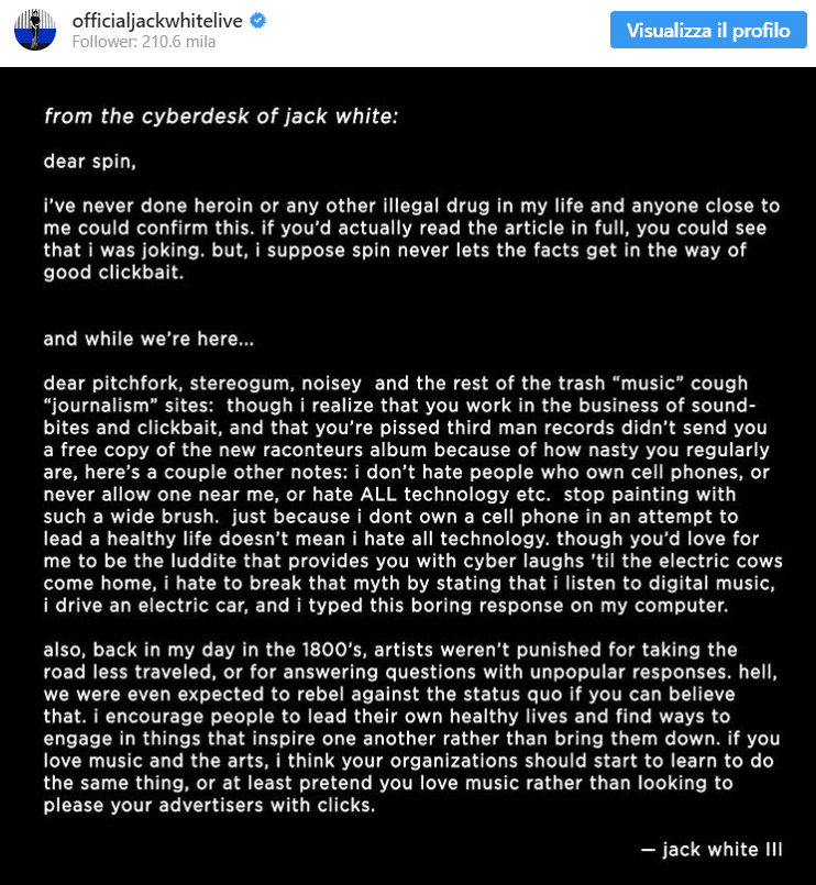 Il lungo messaggio prosegue con White che accusa Spin e altre testate di aver usato la frase per fare clickbait e accaparrarsi visite in più. Tra le altre dichiarazioni travisate, c’era anche quella riguardante la tecnologia. Jack White ha infatti dichiarato di non possedere un cellulare ma quanto detto è stato riportato diversamente, lasciando intendere che avesse detto di odiare chiunque ne possegga uno. Ha fatto seguito una rettifica da parte di Spin.