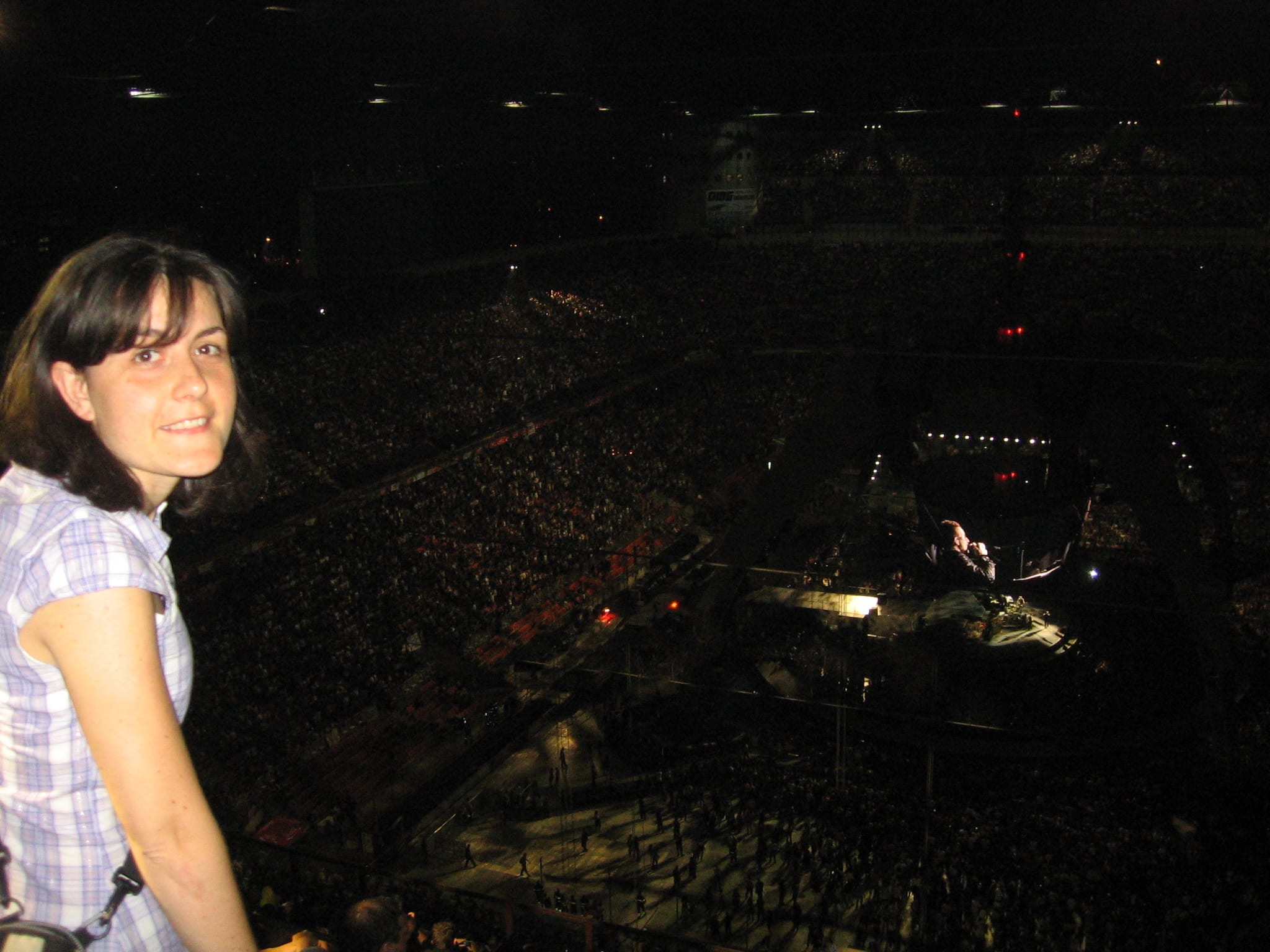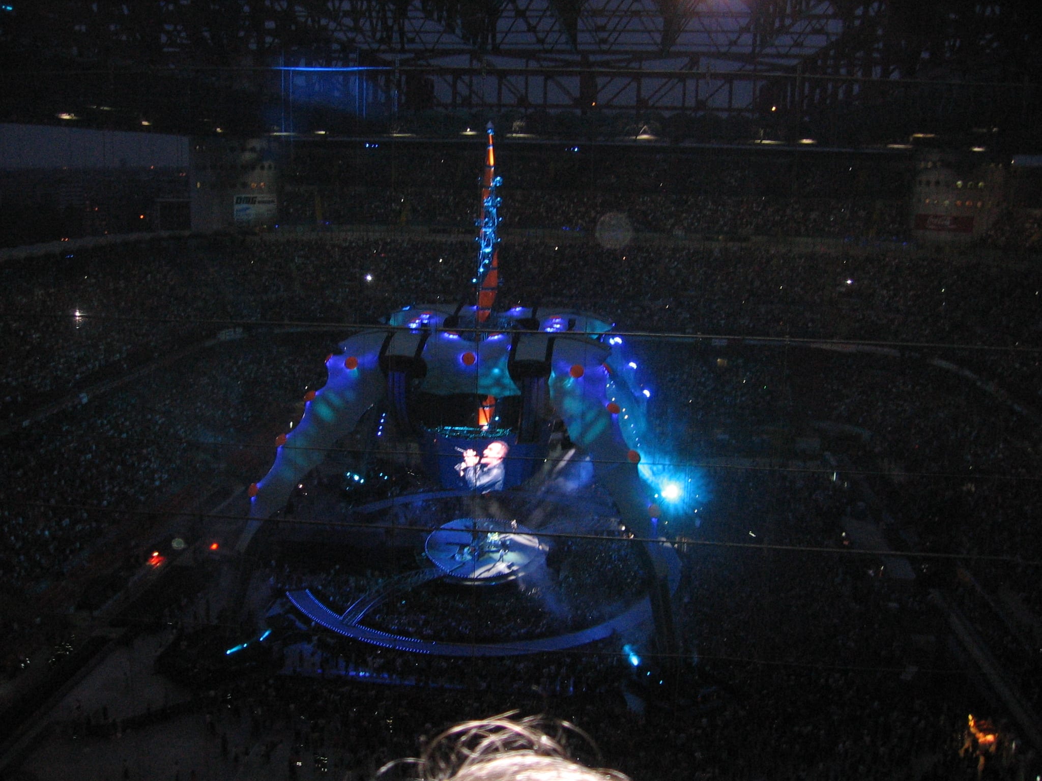 Milano stazione centrale..io e la mia amica ci muoviamo di corsa verso San Siro..sono davvero ad un passo dal “Vertigo”. Arrivati allo stadio, “guidate” dalla marea di gente..mentre facciamo la fila per entrare..ecco che ascolto la bellissima “Chasing cars” degli Snow patrol..gran bel gruppo..ma siamo ancora fuori purtroppoL. Controllo dei biglietti Ok..e via…di corsa verso il terzo anello settore verde…la salita è dura..si gira e rigira con lo sguardo che aspetta con ansia di pogiarsi sul ”the claw”…e come su una terrazza con vista sull’oceano..ecco sopraggiungere lo stupore nel trovarsi davanti a questo grande fiore di cactus (come Bono stesso lo ha definito) e alle migliaia di persone: che spettacolo! Mentre ci sistemiamo gli Snow Patrol cantano “You’re all I have”..l’atmosfera comincia a farsi elettrizzante..manca poco ormai…tutti siamo in attesa dei nostri 4 alieni..”Bono è puntuale” -dice una ragazza accanto a me- “alle 21:00 vedrai cominceranno”..e invece..alle 21 c’è ancora una calma apparente..c’è un “silenzio musicale” interrotto solo dai nostri cori impazienti di accogliere Bono, The Edge, Adam and Larry.