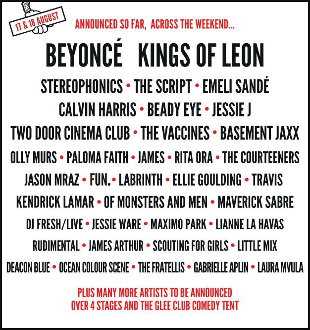 Beyoncé emigrerà in UK come principale rappresentante del V Festival 2013 assieme ai King Of Leon, Stereophonics, The Script, Emeli Sandé e moltissimi altri. Da sottolineare la presenza anche dei Vaccines, Two Door Cinema Club e altre band che si stanno sempre più facendo conoscere nell’ambiente discografico europeo e mondiale. Beyoncé è pronta per tornare in scena e nella sua estate un festival era doveroso, chissà perché ha scelto proprio il V Fesival. Intanto ecco la prima line-up ufficializzata:
