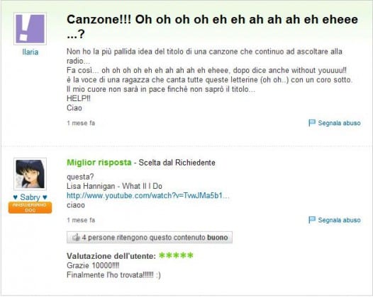 Sembra incredibile, ma è possibile riconoscere una canzone scrivendo i versi che si sentono nel ritornello. Con pochi indizi, Sabrina con due cuoricini è riuscita a risolvere il dilemma di Ilaria. Anche se sarebbe potuta sembrare una qualsiasi canzone degli U2.