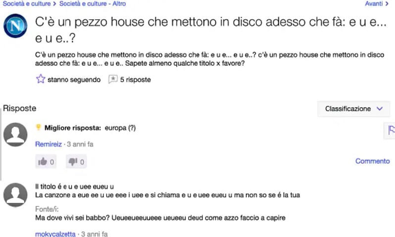 Prima che tutto venga cancellato, per dire addio a Yahoo Answers, abbiamo deciso di raccogliere le migliori domande dedicate al mondo della musica. La piattaforma è stata spesso e volentieri utilizzata per chiedere consigli musicali ma ancor di più per riuscire a trovare i titoli di quelle canzoni che proprio non riesci a ricordare… come “mascialona”, avete presente?